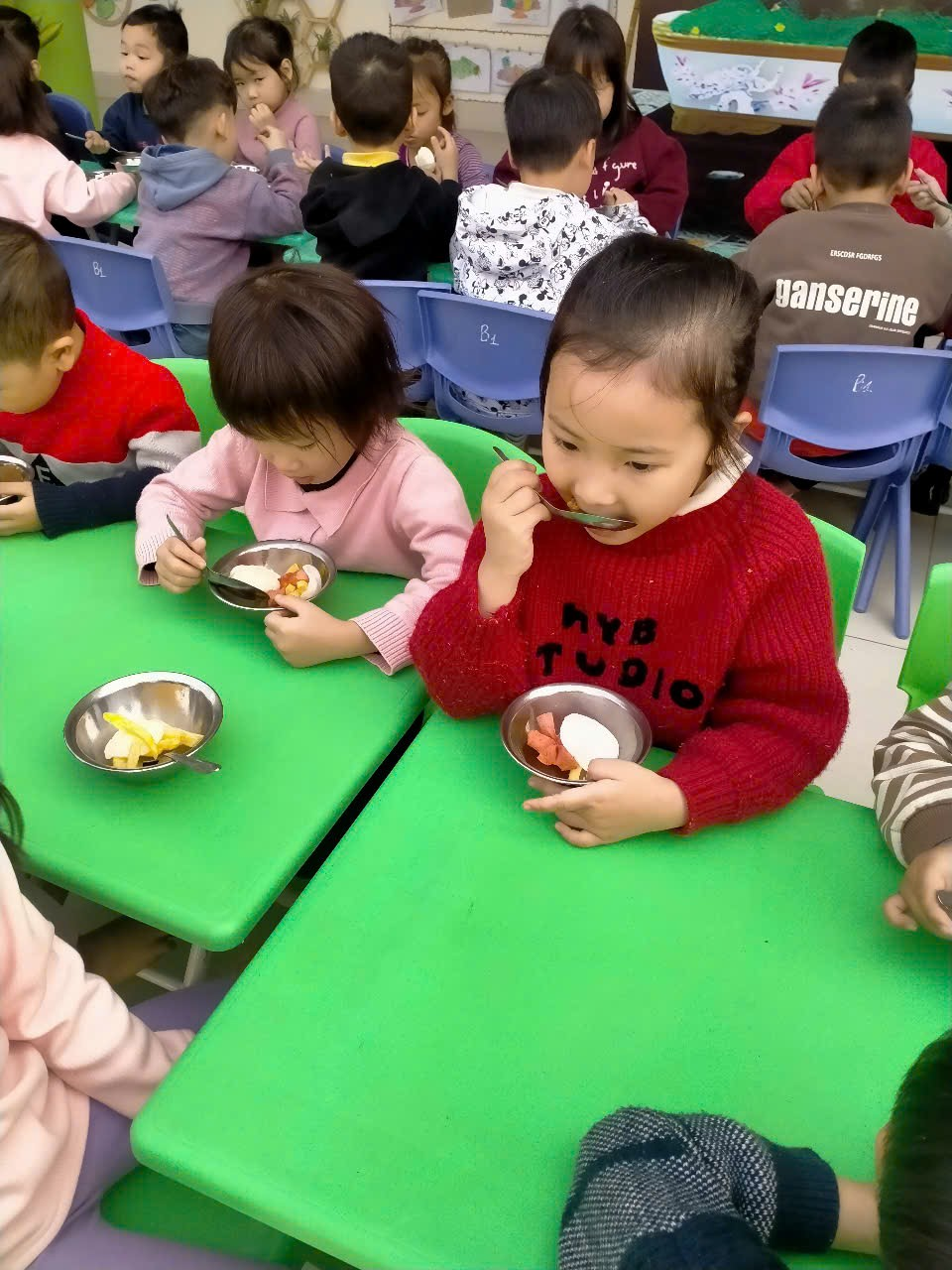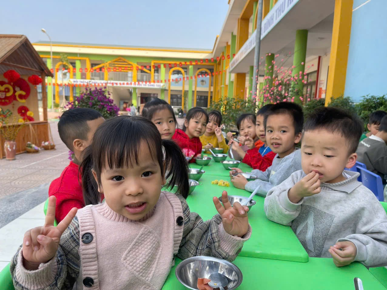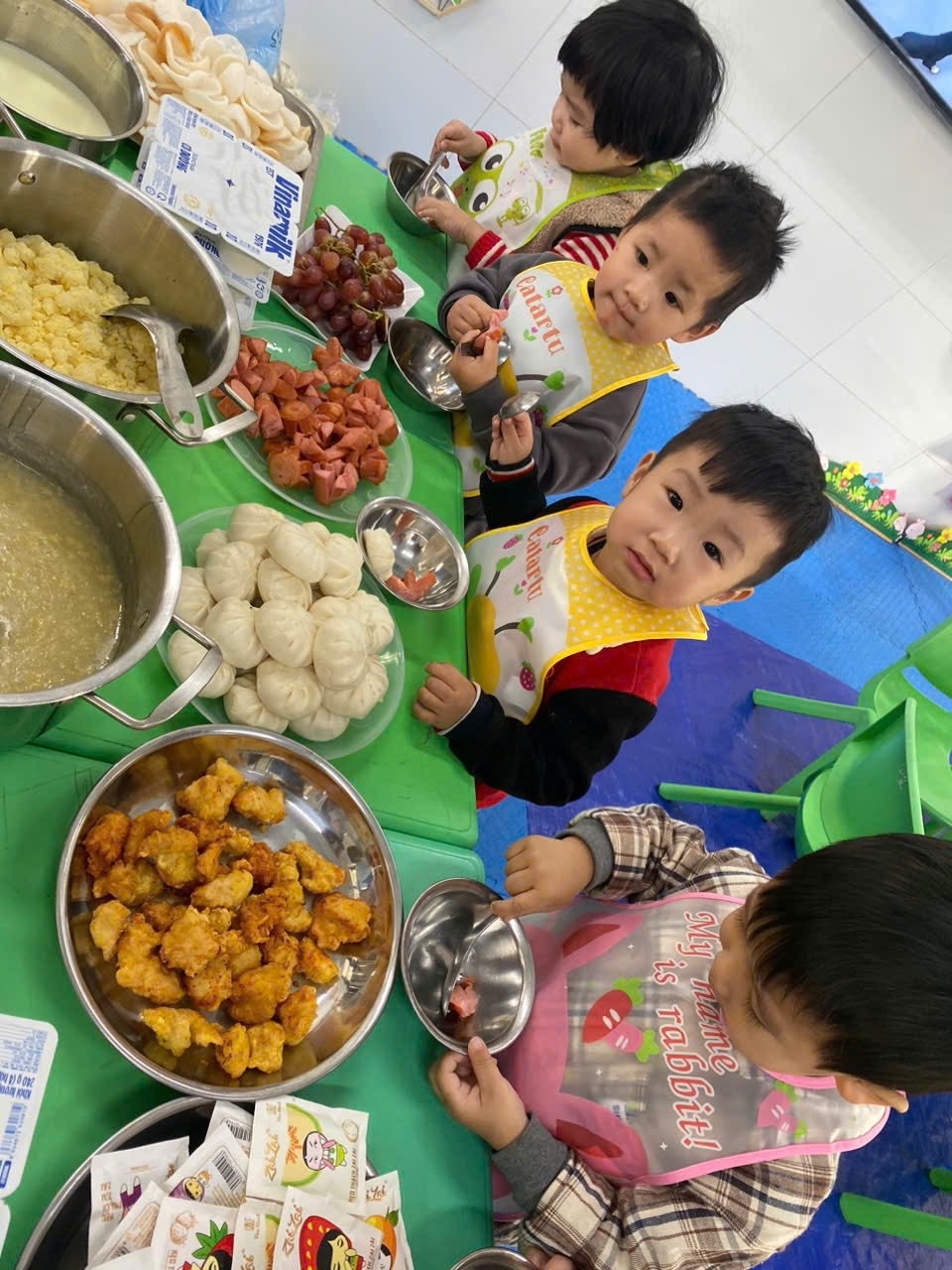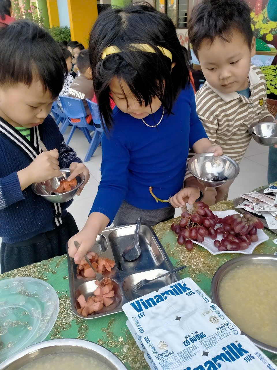 Các bé được cô giáo giới thiệu từng món ăn, hướng dẫn cách ăn uống văn minh, lịch sự như: xếp hàng chờ tới lượt lấy đồ ăn, chọn thức ăn mình thích, lấy vừa đủ, không bỏ thức ăn thừa, không làm rơi vãi thức ăn. Sau khi lấy thức ăn xong, các bé trở về chỗ ngồi của